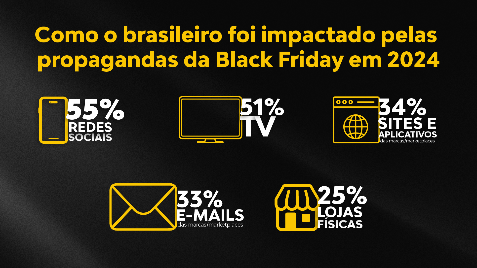 Segundo uma pesquisa realizada pela Mind Miners, 82% dos brasileiros foram impactados por propagandas da Black Friday em 2024. As redes sociais lideraram como principal canal de contato, seguidas pela TV, sites e aplicativos de marcas, lojas físicas e e-mails promocionais.
